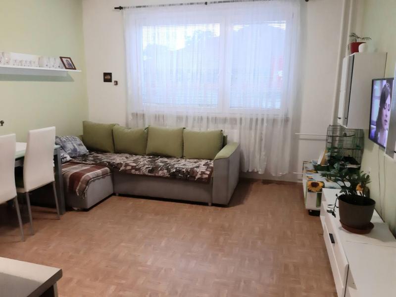 Byt 2+kk s lodžií se nachází ve zvýšeném přízemí panelového domu v Dobiášově ulici. Byt je v osobním vlastnictví a lze jej použít jako zástavu pro hypoteční úvěr. Byt sestává z předsíně, z níž se vstupuje zvlášť do obývacího pokoje s kuchyňským koutem a zvlášť do ložnice s lodžií. Zrekonstruovaná zděná kouplna s WC je rovněž přístupná z předsíně. V bytě jsou plastová okna se žaluziemi, jsou vyměněny stoupačky, dům je z boku zateplen. K bytu patří sklep, k dispozici je sušárna. V místě je kompletní občanská vybavenost.