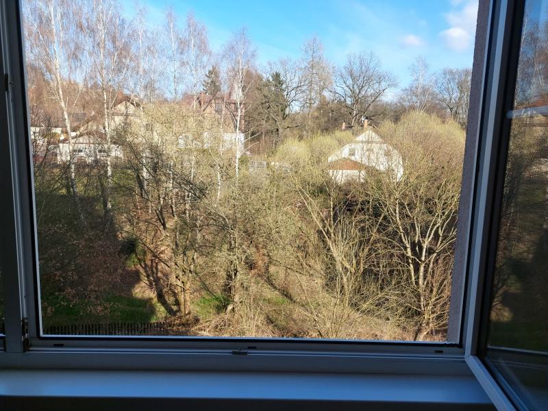 Z okna je půvabný výkled do zeleně.