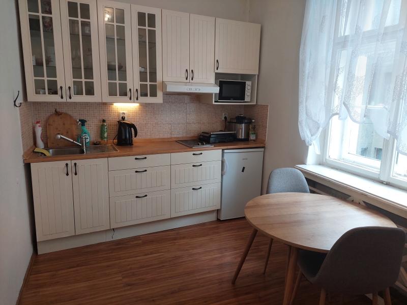 K vybavení bytu patří kuchyňská linka se sklokeramickou dvouplotýnkou a ledničkou. Koupelna se sprchovým koutem je společná s WC.